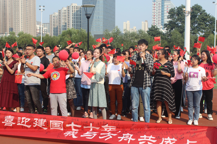 接著,大家在主席臺(tái)前集合,齊聲合唱《我和我的祖國(guó)》,大家一邊興奮地?fù)u動(dòng)著手中的小紅旗,一邊動(dòng)情地唱著歌,深情的歌聲和大家興奮的臉龐相應(yīng)和,充分表現(xiàn)出了員工們對(duì)祖國(guó)的熱愛。